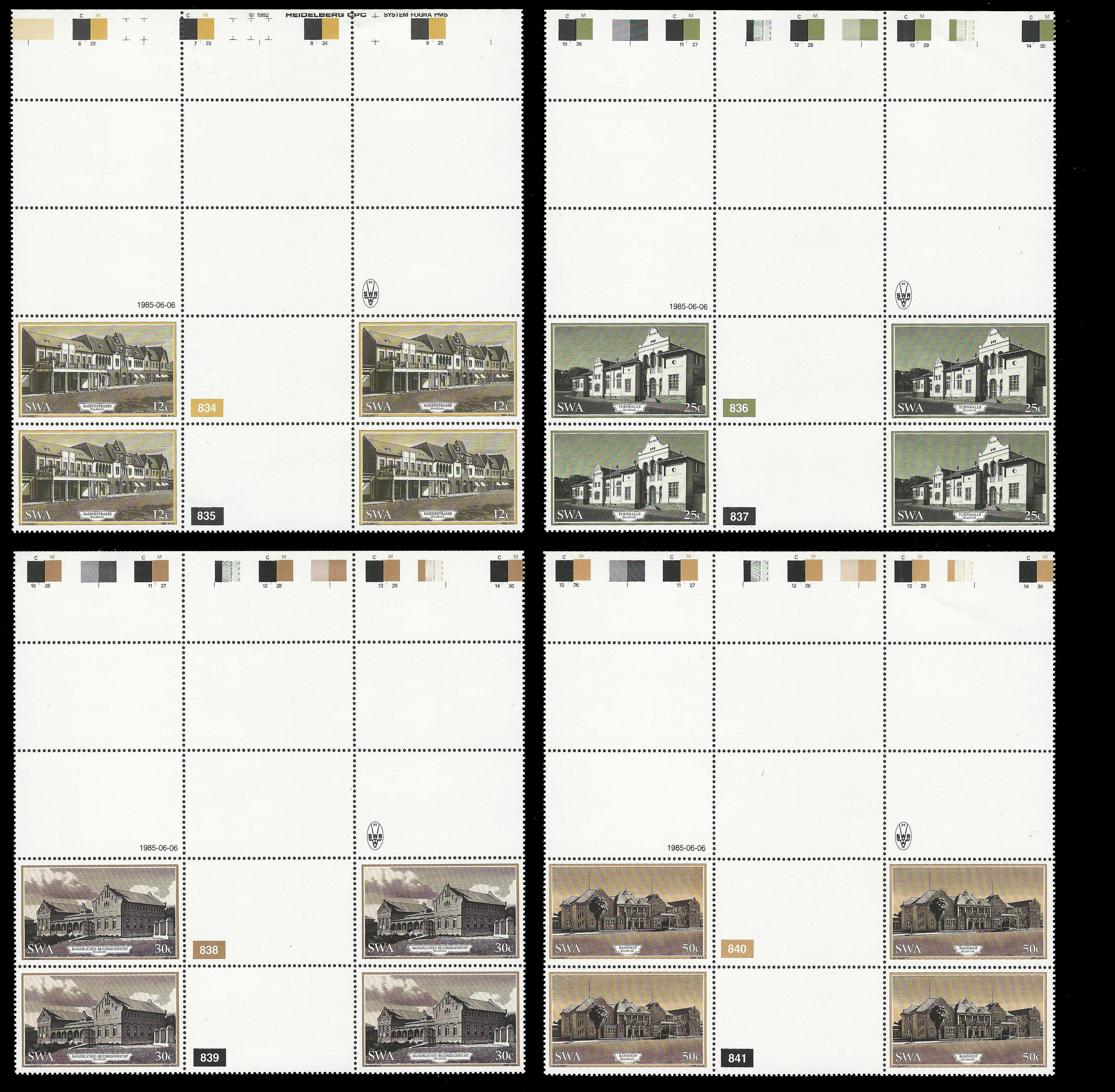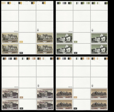 South West Africa. Proofs ex the Archives. 1985 Historic Buildings (SACC 454/7). Complete set of Top Marginal Control Blocks. Very fine unmounted mint. Only THREE such sets exist.