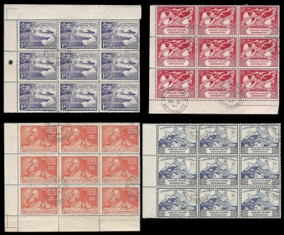 Falkland Island Dependencies. 1949 U.P.U. set (SG G21/4) in used / CTO blocks of 9. Catalogue value R2 300-00 (£99-00). Very fine condition with a couple of perfs splitting.