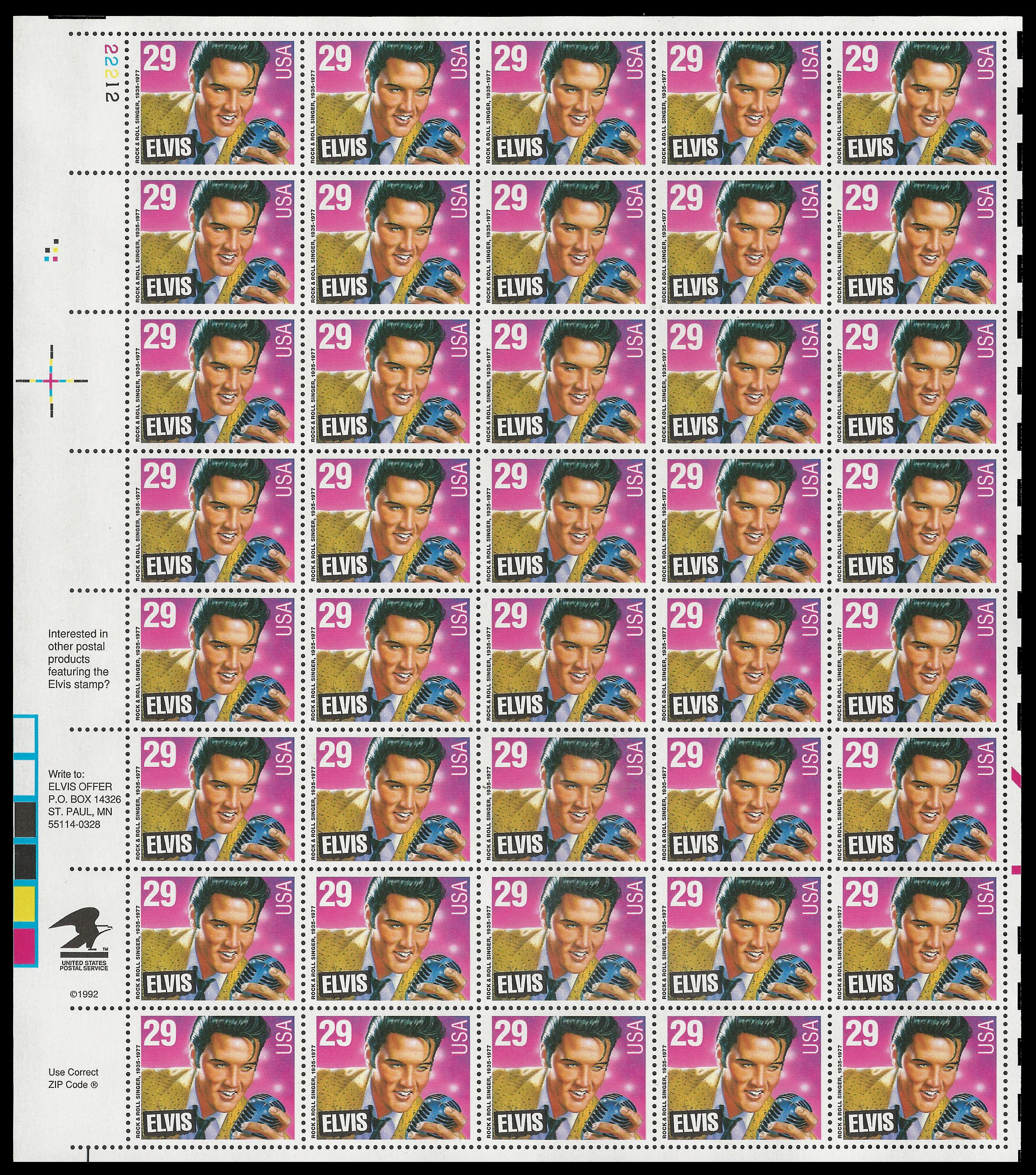 United States of America. 1992 Elvis Presley issue in a complete sheet of 40. FACE value R220-00. Very fine unmounted mint.