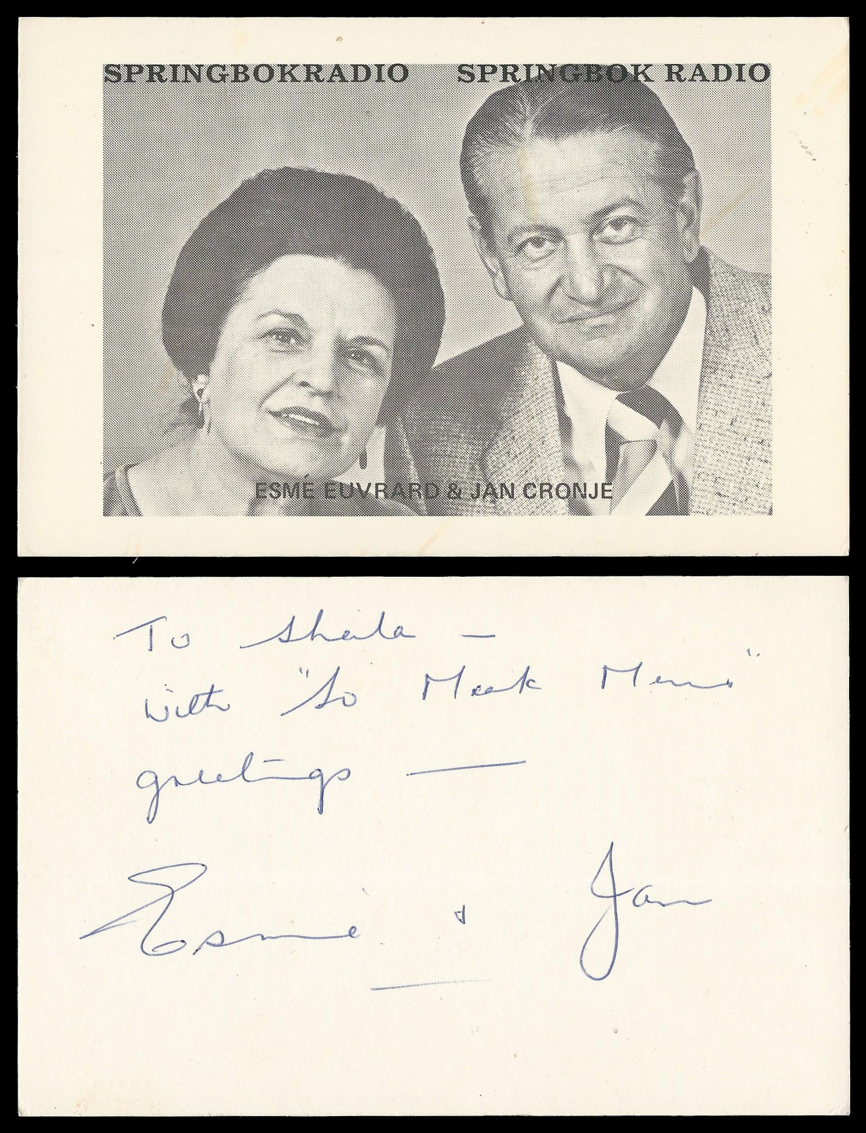Photo card signed by the Springbok Radio legends Esmé Euvrard and Jan Cronje.