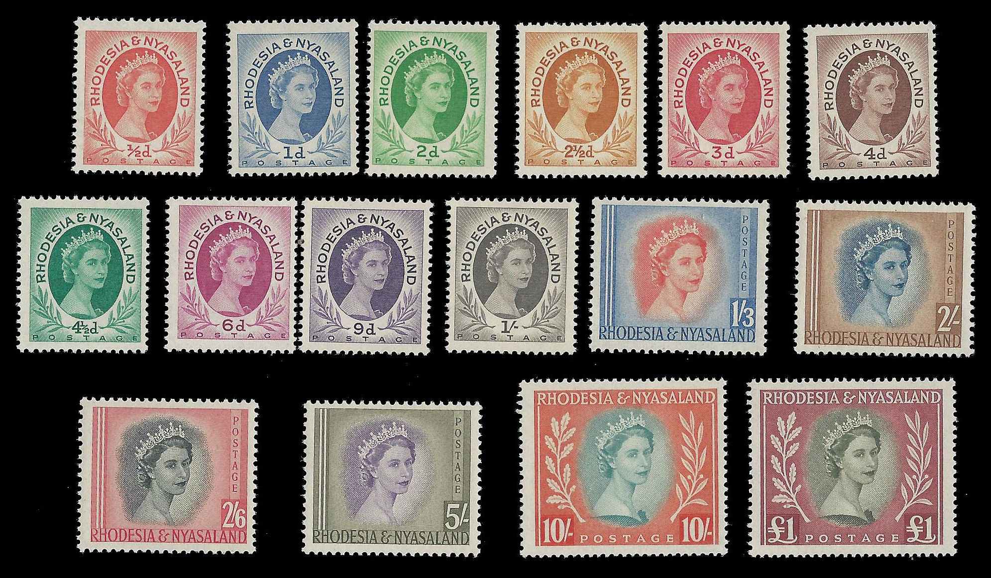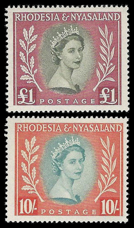 Rhodesia and Nyasaland. 1954 QE II complete set (SACC 1/15). Only 2 values shown on first scan – complete set on second scan. Superb unmounted mint. Catalogue value R2 778-00