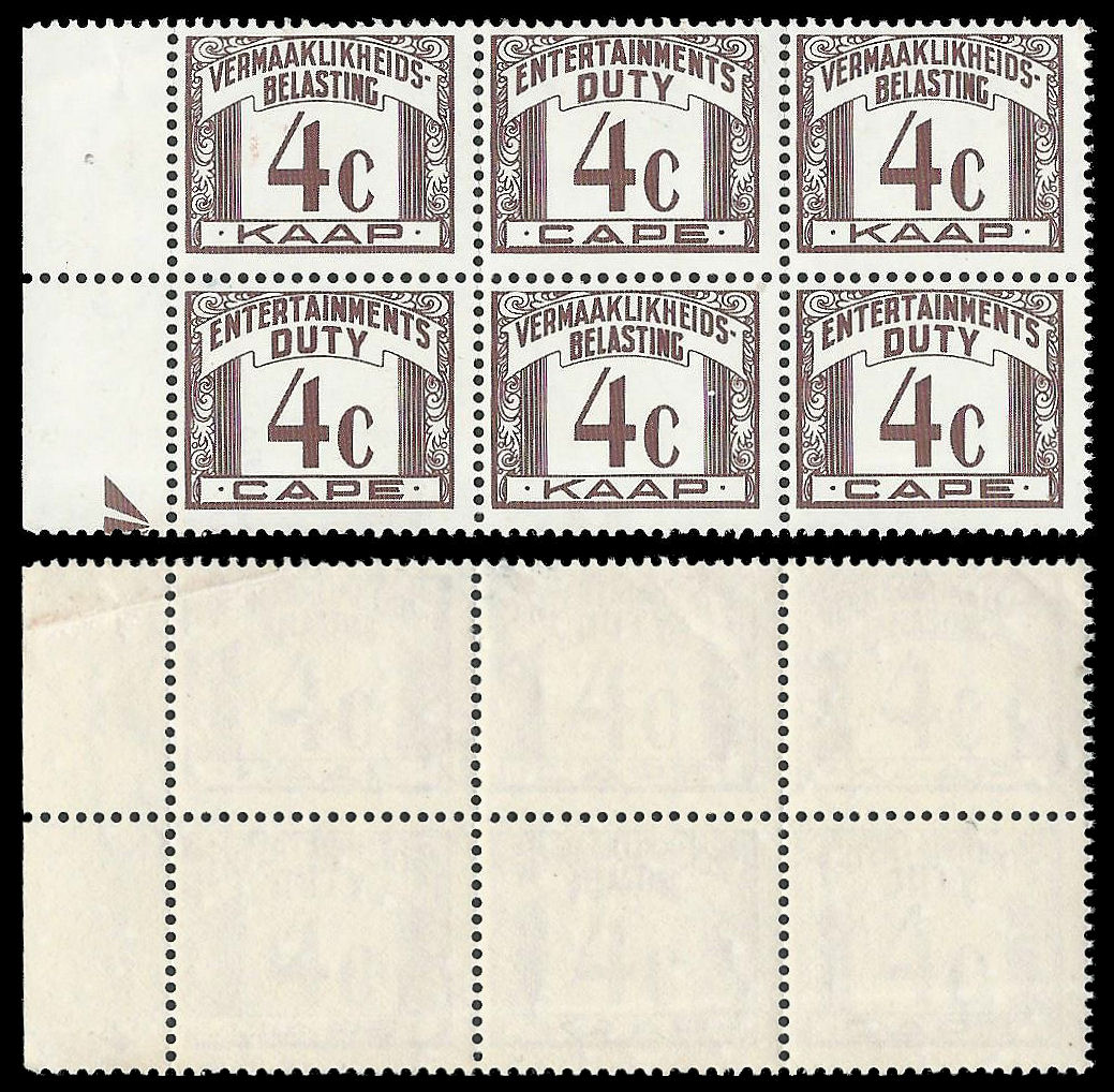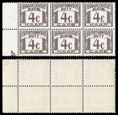 Republic of South Africa – Cape (Province). 4c Entertainment Tax stamp (Barefoot 43) in a part arrow block of 6. Superb unmounted mint except for crease top left.