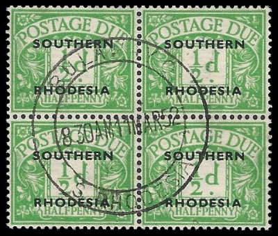 Southern Rhodesia. 1951 ½d Postage due (SACC 1) very fine used / CTO in a block of 4. Catalogue value R1 000-00.