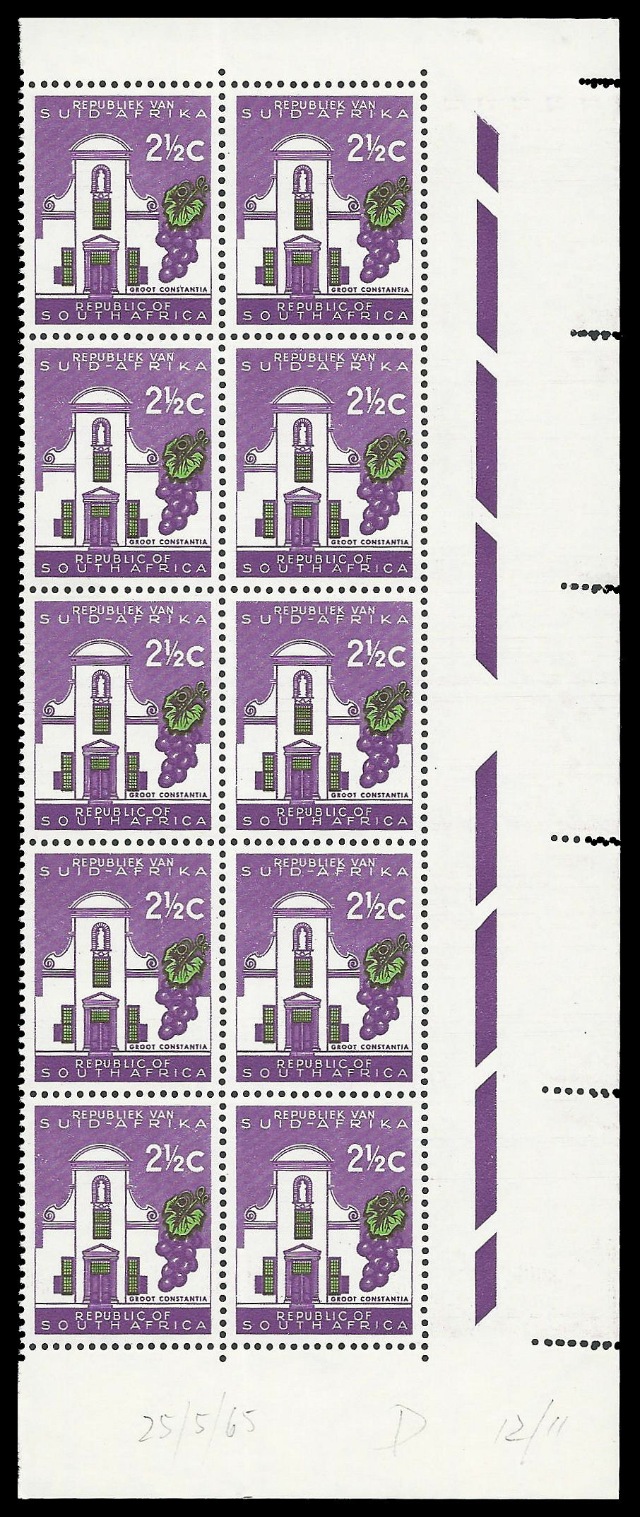 Republic of South Africa. 1963 2½c RSA Watermark (SACC 229) in a marginal Block of 10 with Extra and Double Extra Perfs in margin. Very fine unmounted mint.