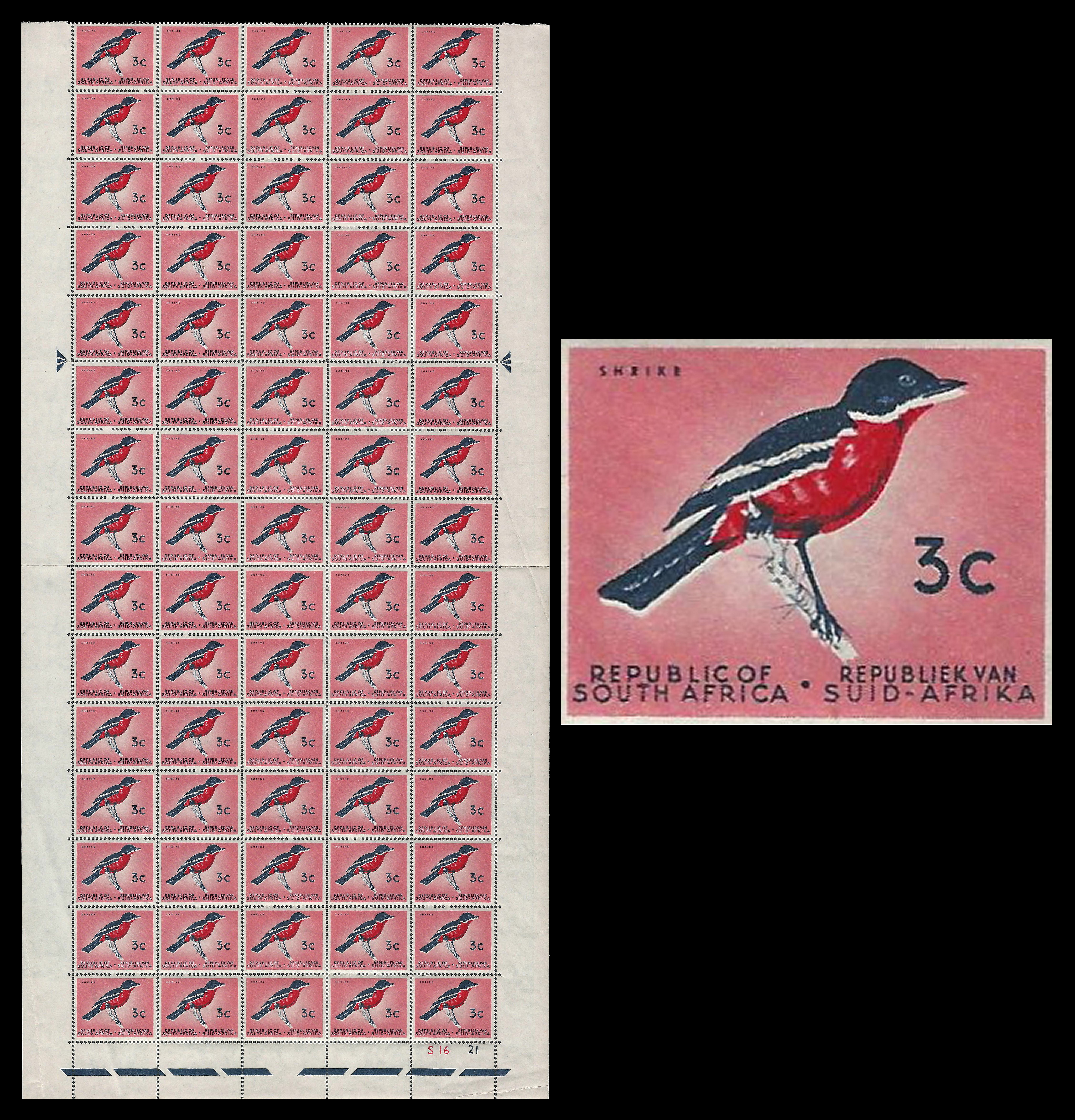 Republic of South Africa. 1961 3c COA Watermark (SACC 202) in a part sheet of 75 with gradual Colour Shift. Some marginal creasing (5 stamps affected) + marginal damage to control block (premium for control ignored). Otherwise very fine unmounted mint. Catalogue value as normal R3 375-00.