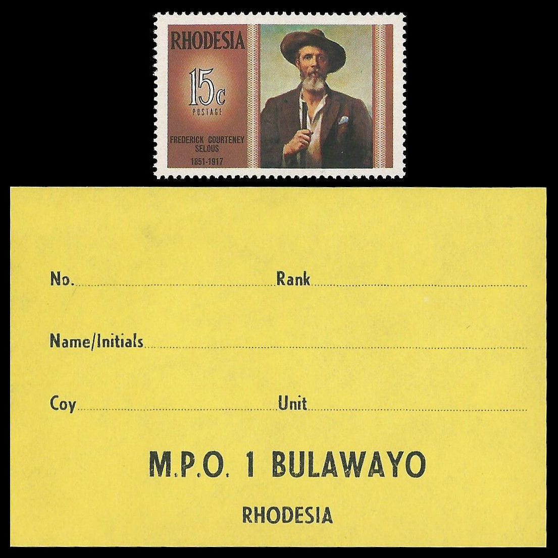 Rhodesia Bush War. M.P.O. label M.P.O. 1 – Bulawayo. Superb unused condition / “unmounted mint”. The stamp is included to show the size of the label. 3 Labels available.