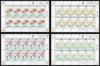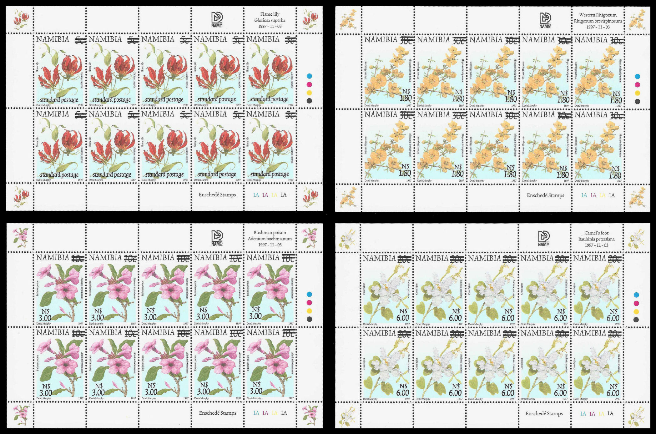 Namibia. 2001 Definitive Surcharges (SACC 322/5) in a complete set of complete sheets. Very fine unmounted mint. Catalogue value as single stamps R1 300-00.