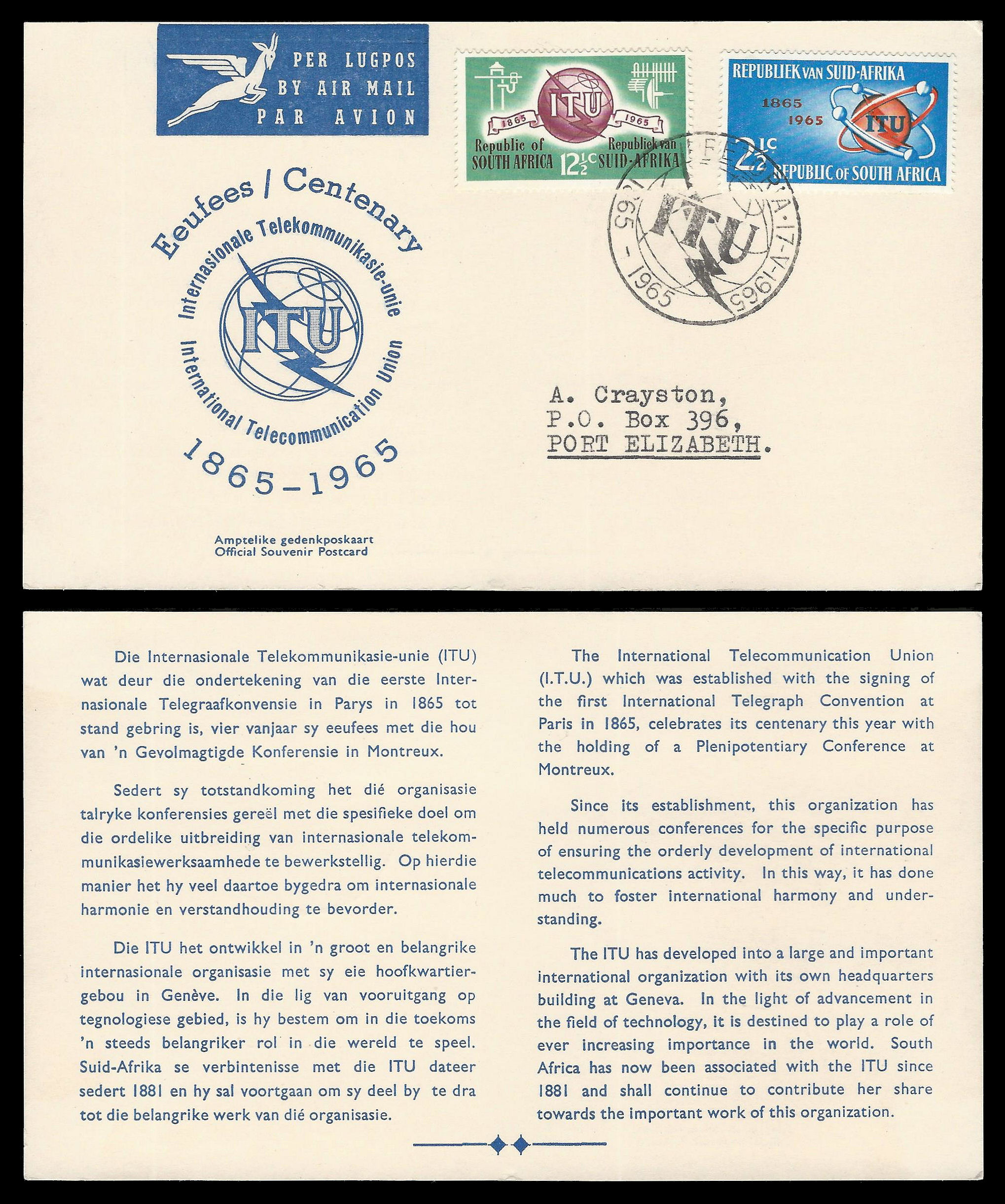 Republic of South Africa. 1965 I.T.U. FDC No.1 – 2 Diamonds. Very fine condition as per scan. Catalogue value R1 500-00.