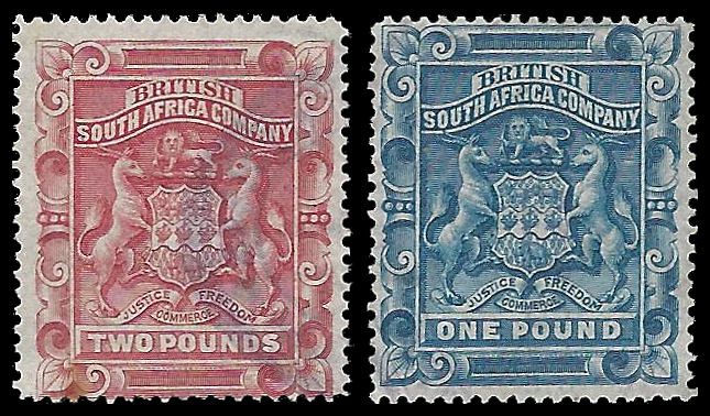 B.S.A.C. 1892 One Pound + 2 Pound (SACC 10/11) fiscally used. Catalogue value for postally used R7 000-00.