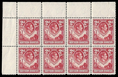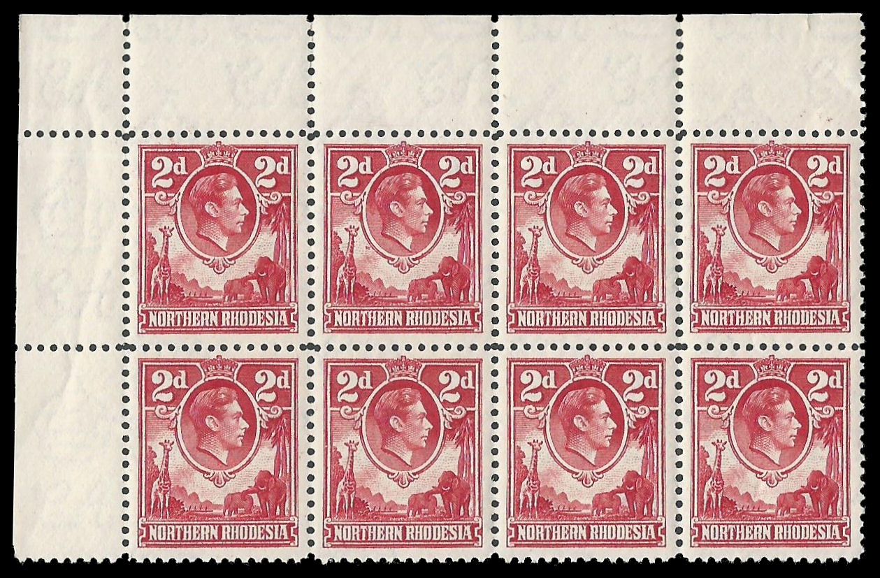 Northern Rhodesia. 1941 King George VI 2d Carmine (SACC 32) in a Top Left Corner Block of 8. Very fine unmounted mint. Catalogue value R320-00.