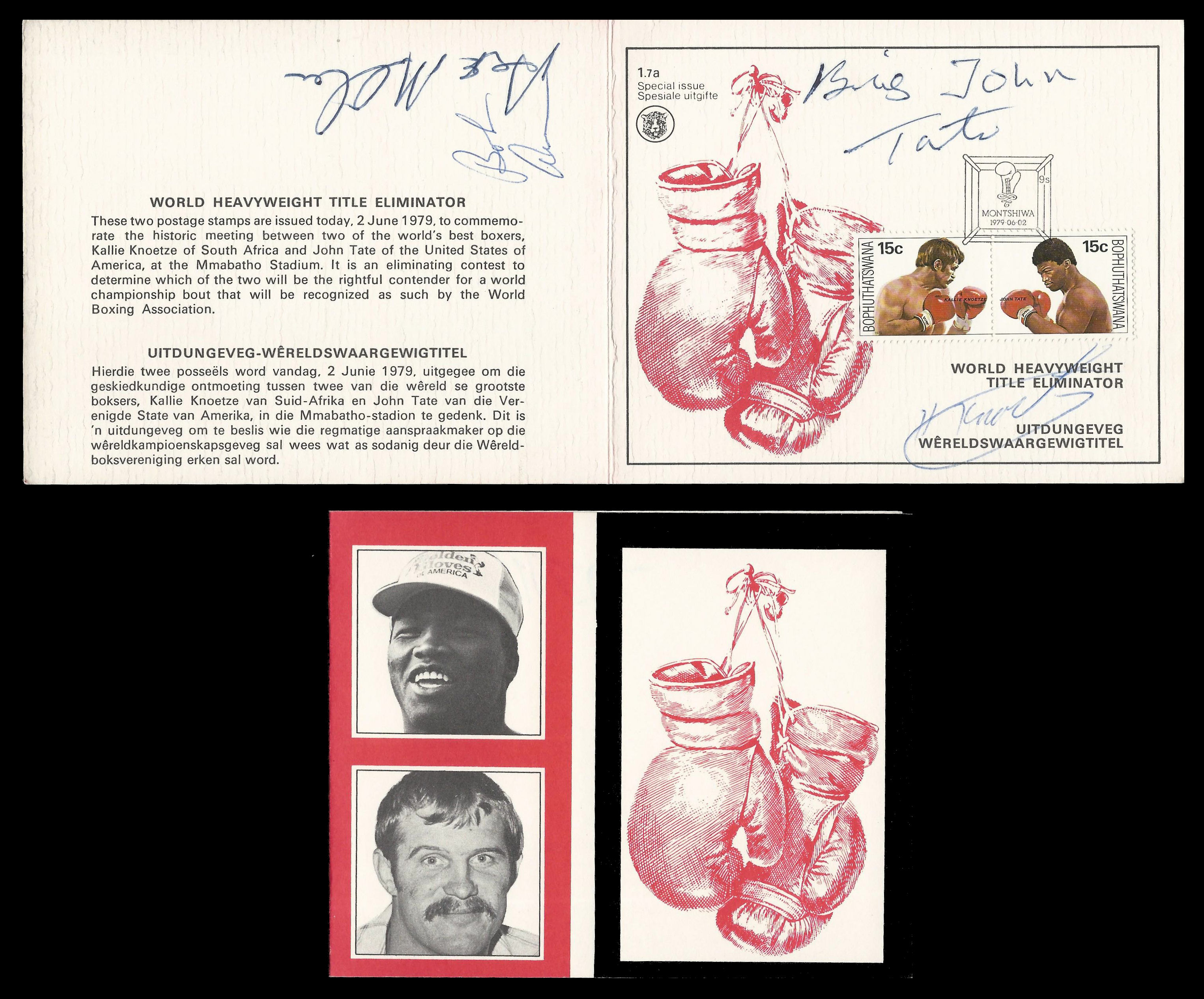 Bophuthatswana. 1979 Collector’s Sheet signed by (later to become) World Boxing Champion (Big) John Tate and Kallie Knoetze, as well Tate’s trainer Ace Miller and boxing promoter Bob Arum.