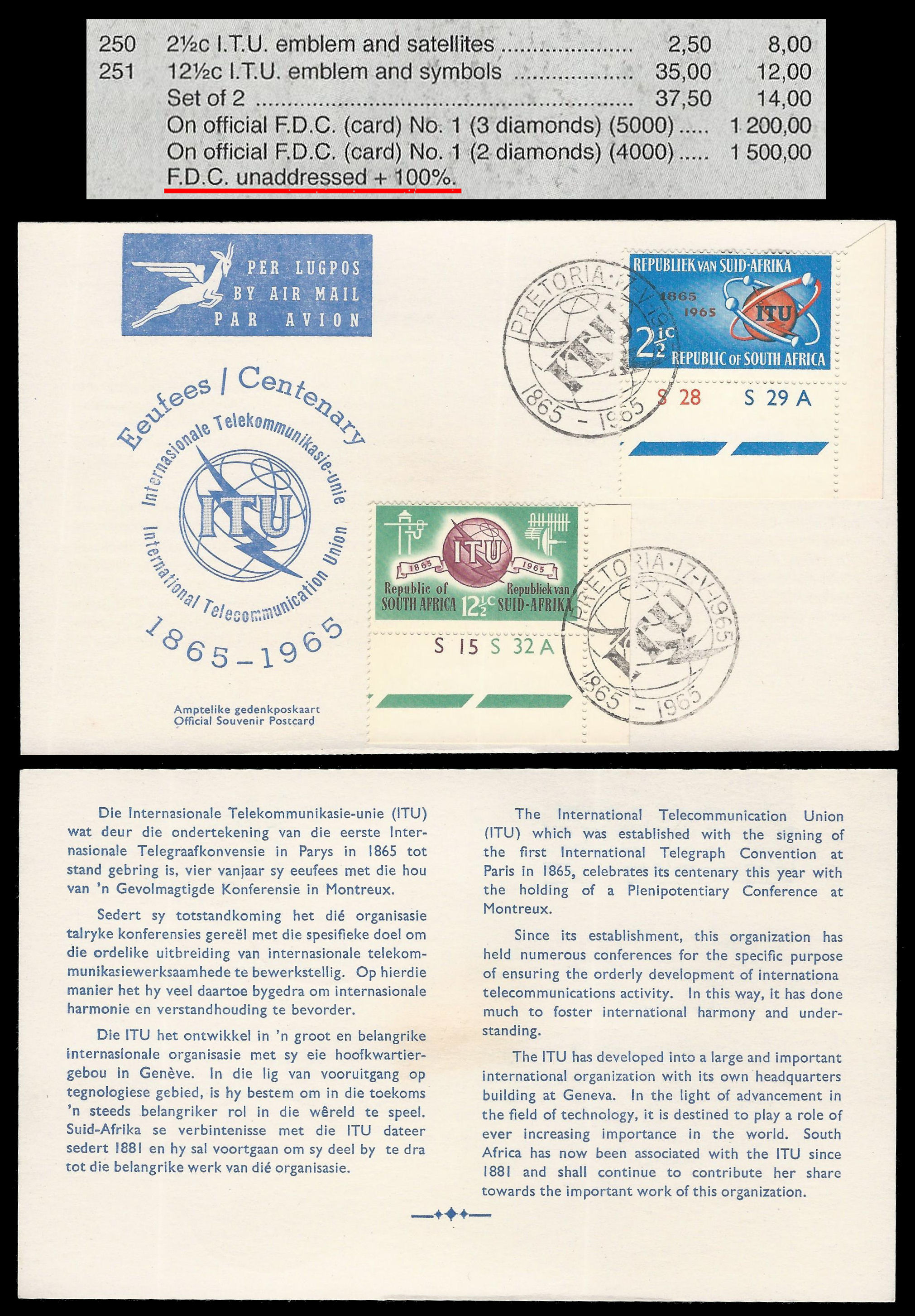 Republic of South Africa. 1965 I.T.U. FDC No.1 – 3 Diamonds. Stamps with Full Control Numbers. Very fine condition as per scan. Catalogue value as normal R2 400-00.