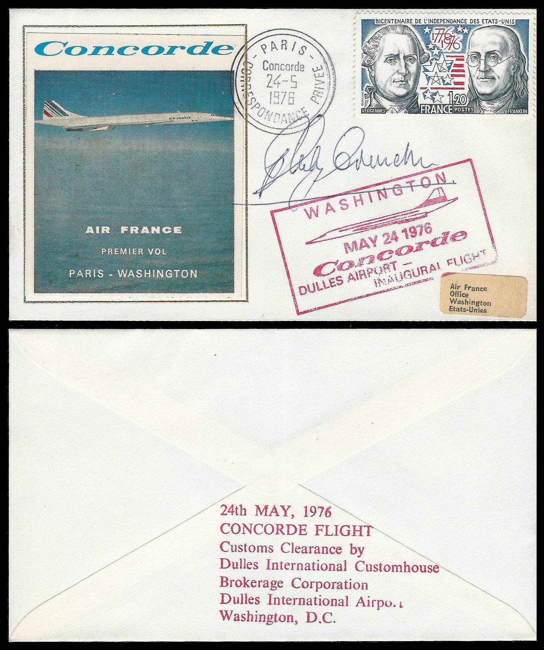 Concorde. 1976 Air France Signed Cover - First Commercial Flight of the Concorde into the U.S.A. Paris to Dulles Airport, Washington. Very fine condition.