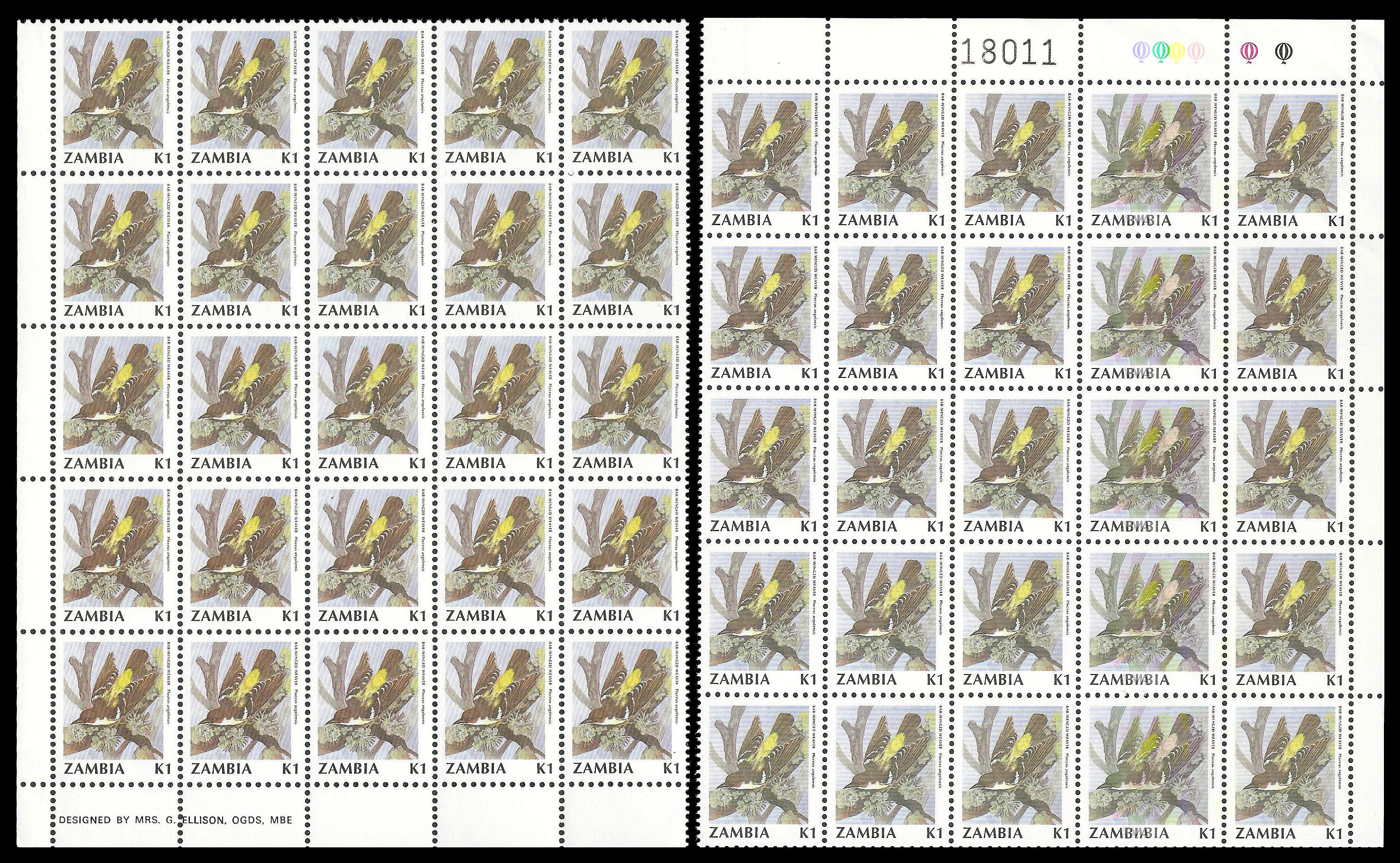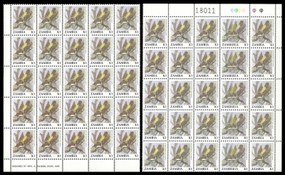 Zambia. 1990 Birds. The 1K value (SG 630) in two blocks of 25 each as per scan. Very fine unmounted mint - slight fold at top right in margin of right hand block. Catalogue value R2 200-00 (£100-00).