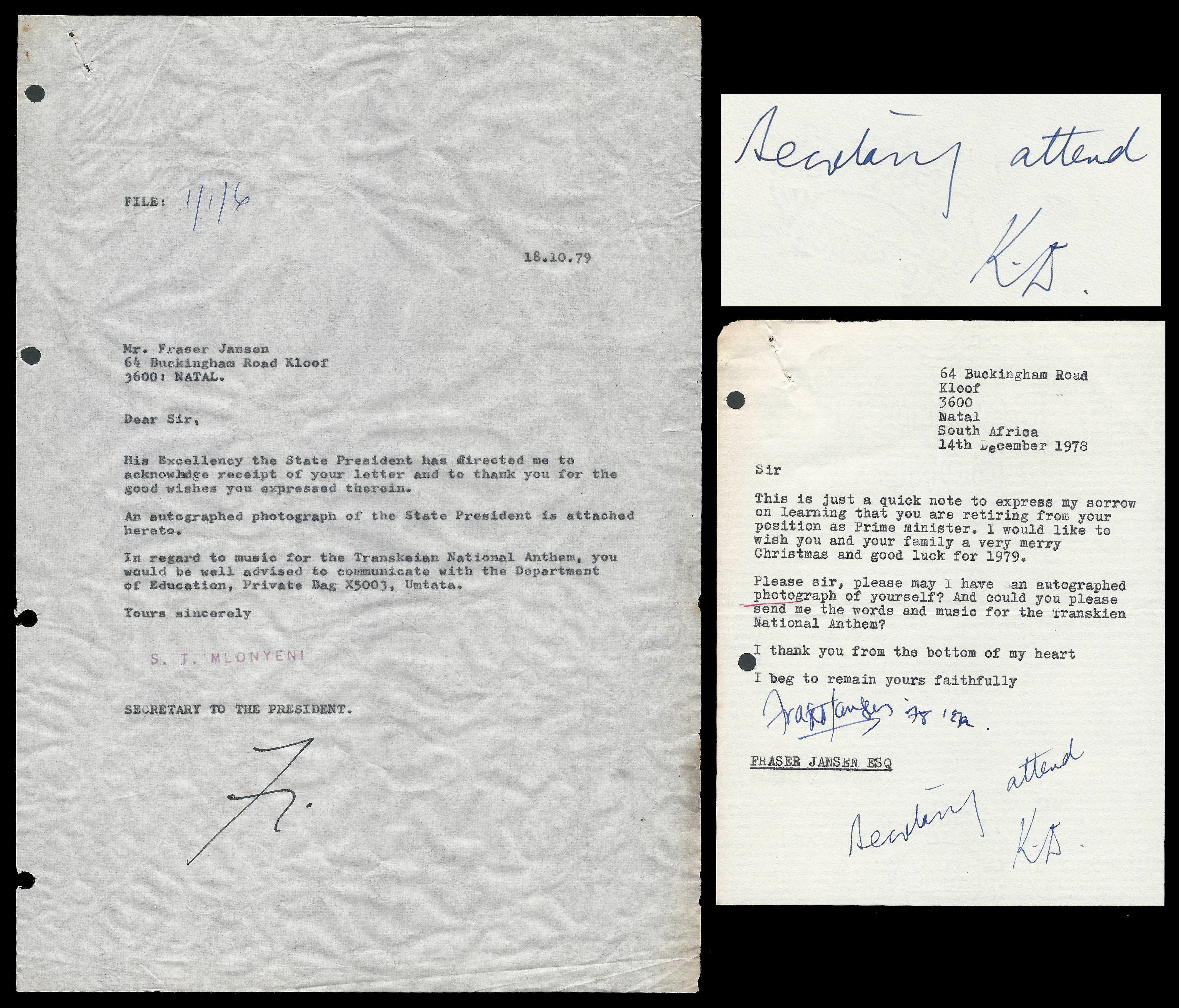 Transkei. 1978 Letter to K.D. Matanzima as Prime Minister of Transkei (initialled by him). The letter was answered 10 months later, when K.D. was State President of Transkei. Fine condition as per scan.