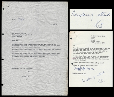 Transkei. 1978 / 1979. 2 Related letters to and from K.D. Matanzima. The one when K.D. was Prime Minister, the other when he was President. First letter initialled by President Matanzima.