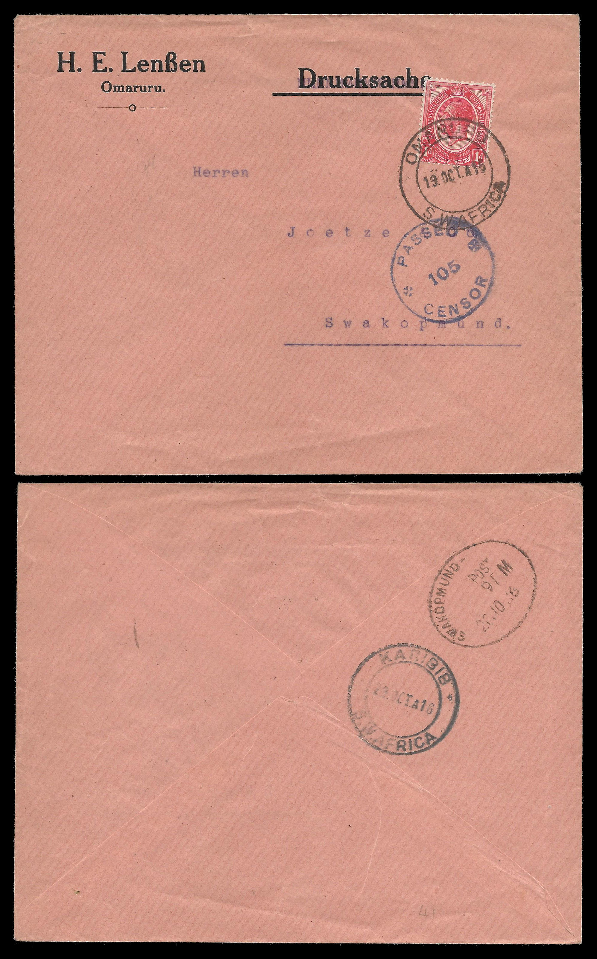 South West Africa - South African Occupational Period. 1915 Censored Cover from Omarura to Swakopmund via Karibib as per scan.