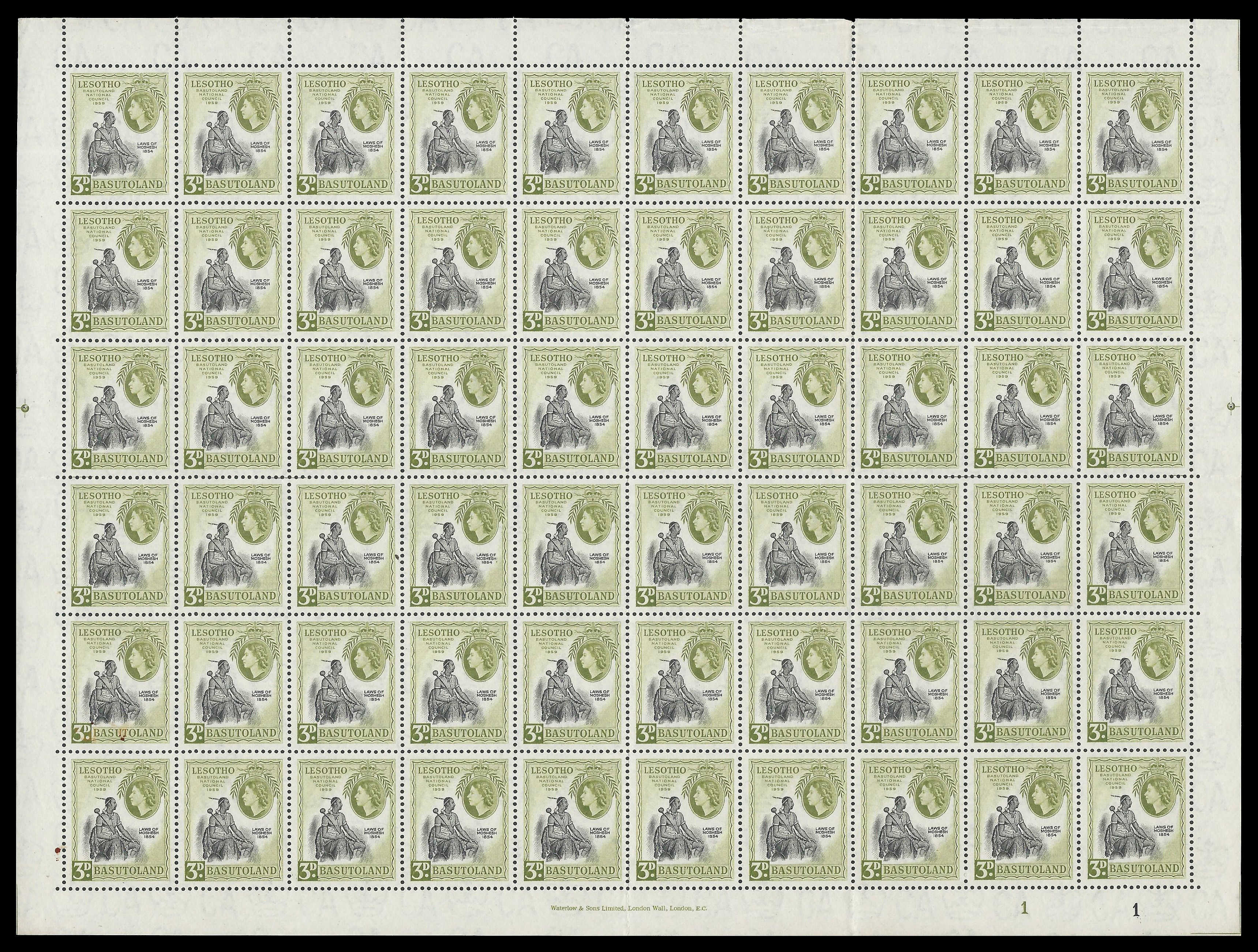 Basutoland. 1959 National Council 3d (SACC 55) in a complete sheet. Very fine unmounted mint - small mark in bottom left margin.