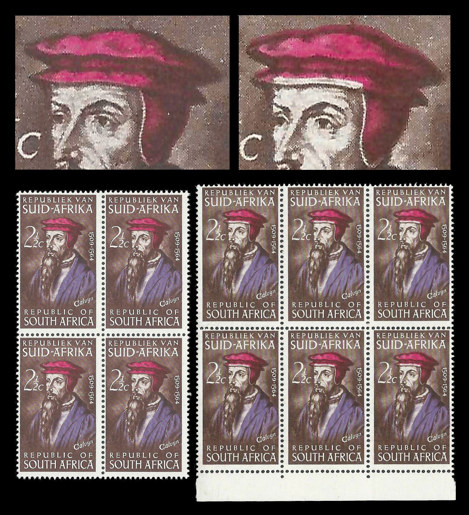 Republic of South Africa. 1964 2½c Calvin (SACC 247) in a Bottom Marginal Block of 6 with "White Line in Cap" variety. Very fine unmounted mint. Normal block NOT included
