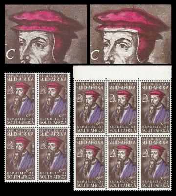 Republic of South Africa. 1964 2½c Calvin (SACC 247) in a Top Marginal Block of 6 with "White Line in Cap" variety. Very fine unmounted mint. Normal block NOT included.