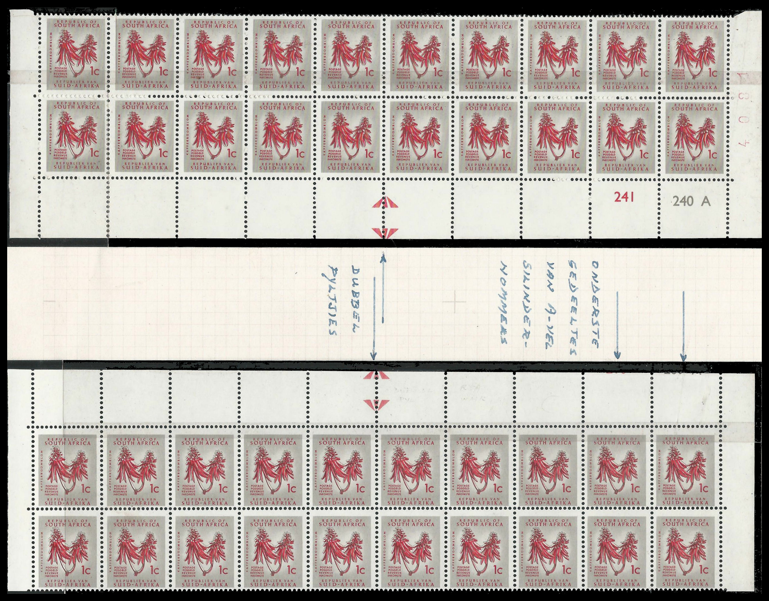 Republic of South Africa. First definitive 1c Redrawn (SACC 237b) in two blocks of 20. Each with Double Arrows from Miscut Sheet as per scan. Very fine unmounted mint.
