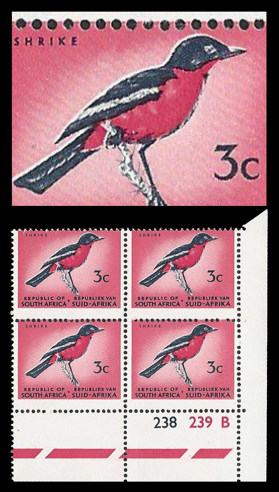 Republic of South Africa. 1967 3c (SACC 266) in a control block of 4 with slight Perforation and Colour Shift. Very fine unmounted mint.