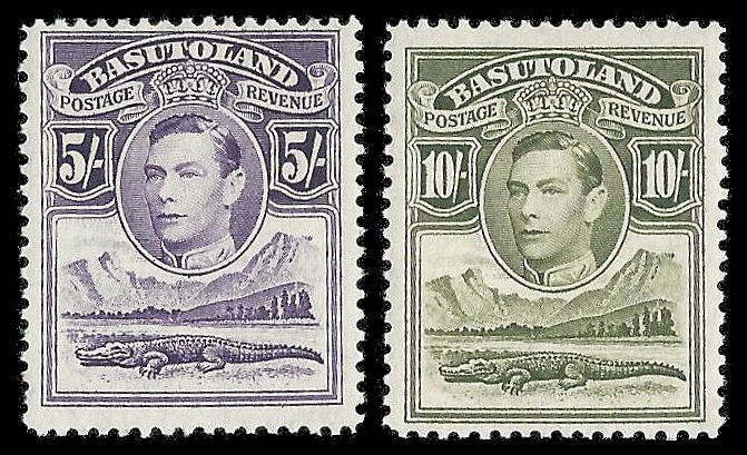 Basutoland. 1 938 KG VI complete set (SACC 18/23). Only the two top values shown. very fine mounted mint. Catalogue value for unmounted mint R3 176-00.