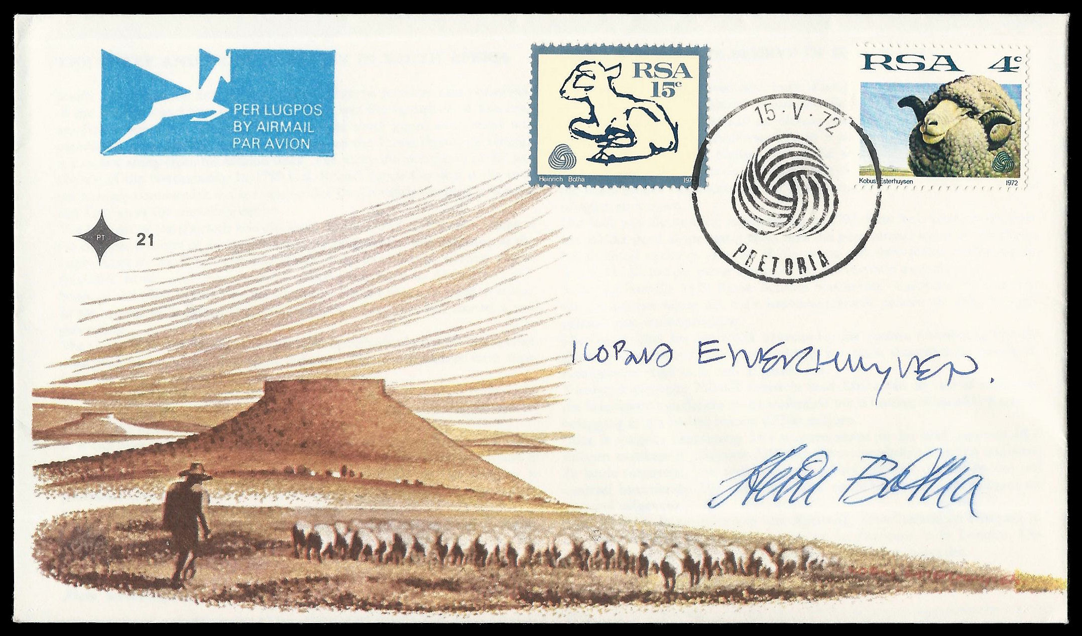 Republic of South. 1972 FDC 21 signed by the designers of both stamps (Hein Botha and Kobus Esterhuysen). Very fine condition.