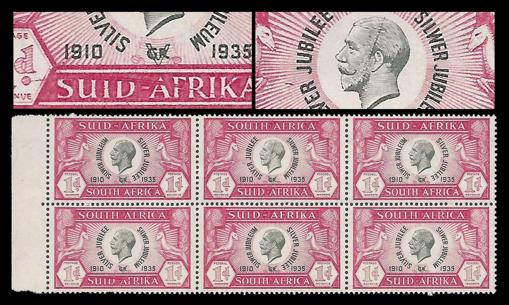 Union of South Africa. 1935 King George V Silver Jubilee 1d (SACC 65) in a block of 6 with Cleft Skull + Scratch Through Suid-Afrika. Very fine unmounted mint.